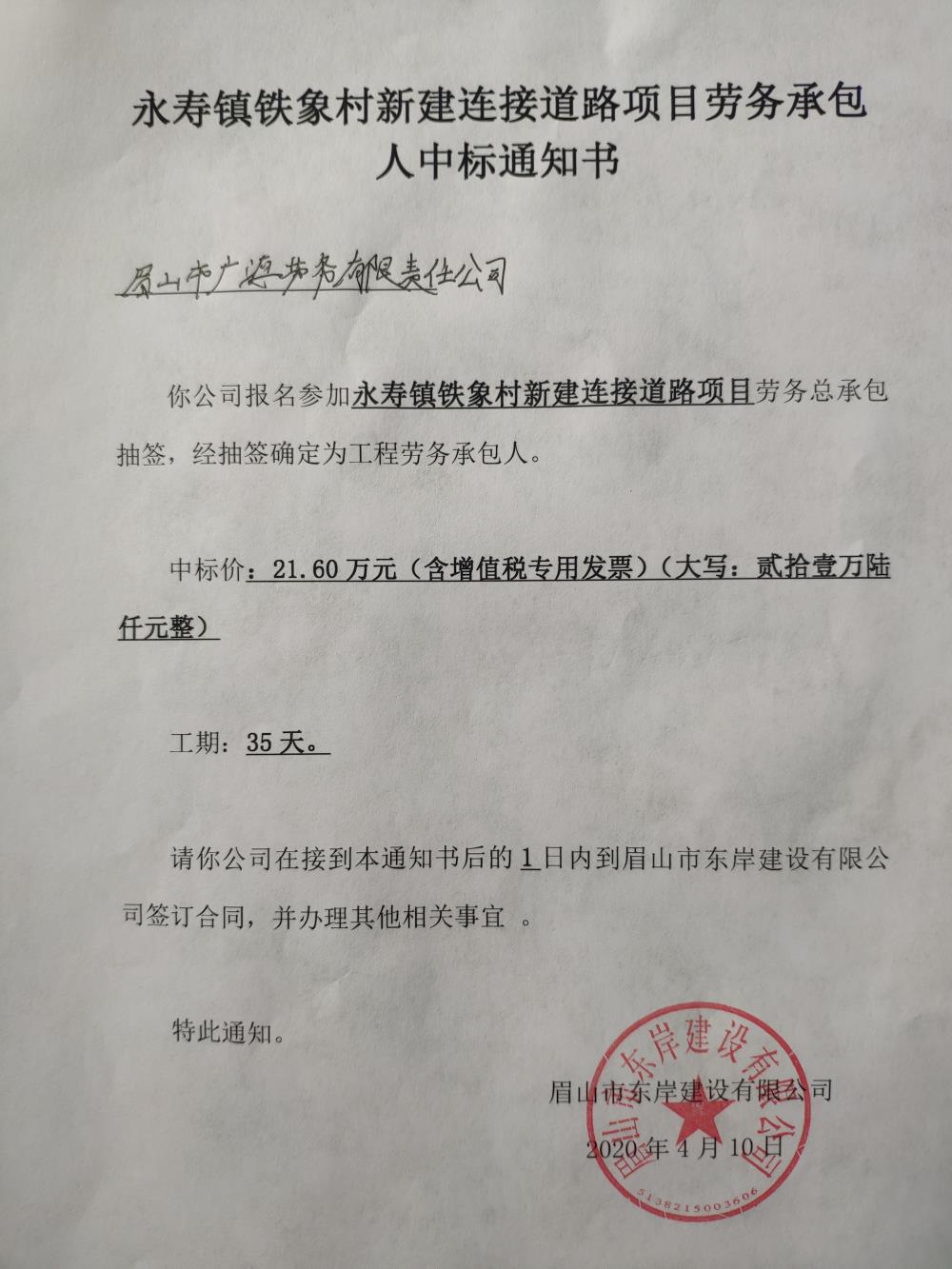 永壽鎮(zhèn)鐵象村新建連接道路項目中標通知