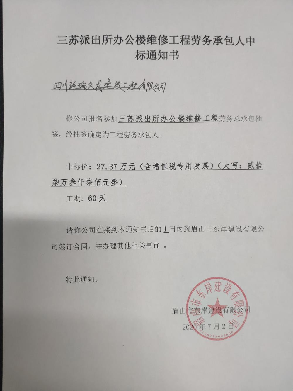 三蘇派出所辦公樓維修工程和崇禮鎮(zhèn)幼兒園建設(shè)項目室內(nèi)裝飾工程中標通知