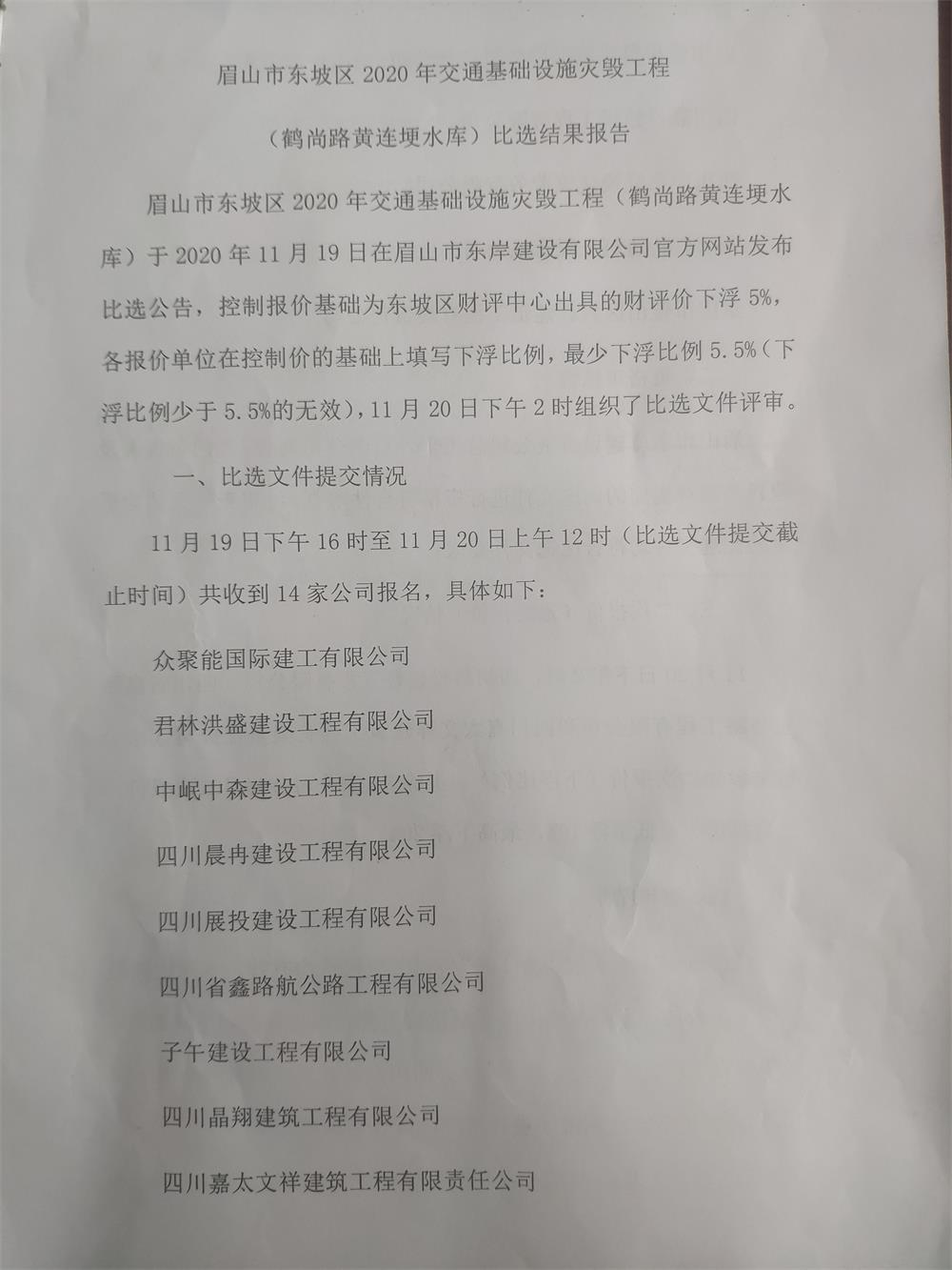 眉山市東坡區(qū)2020年交通基礎(chǔ)設(shè)施災(zāi)毀工程(鶴尚路黃連埂水庫)勞務(wù)隊伍比選結(jié)果